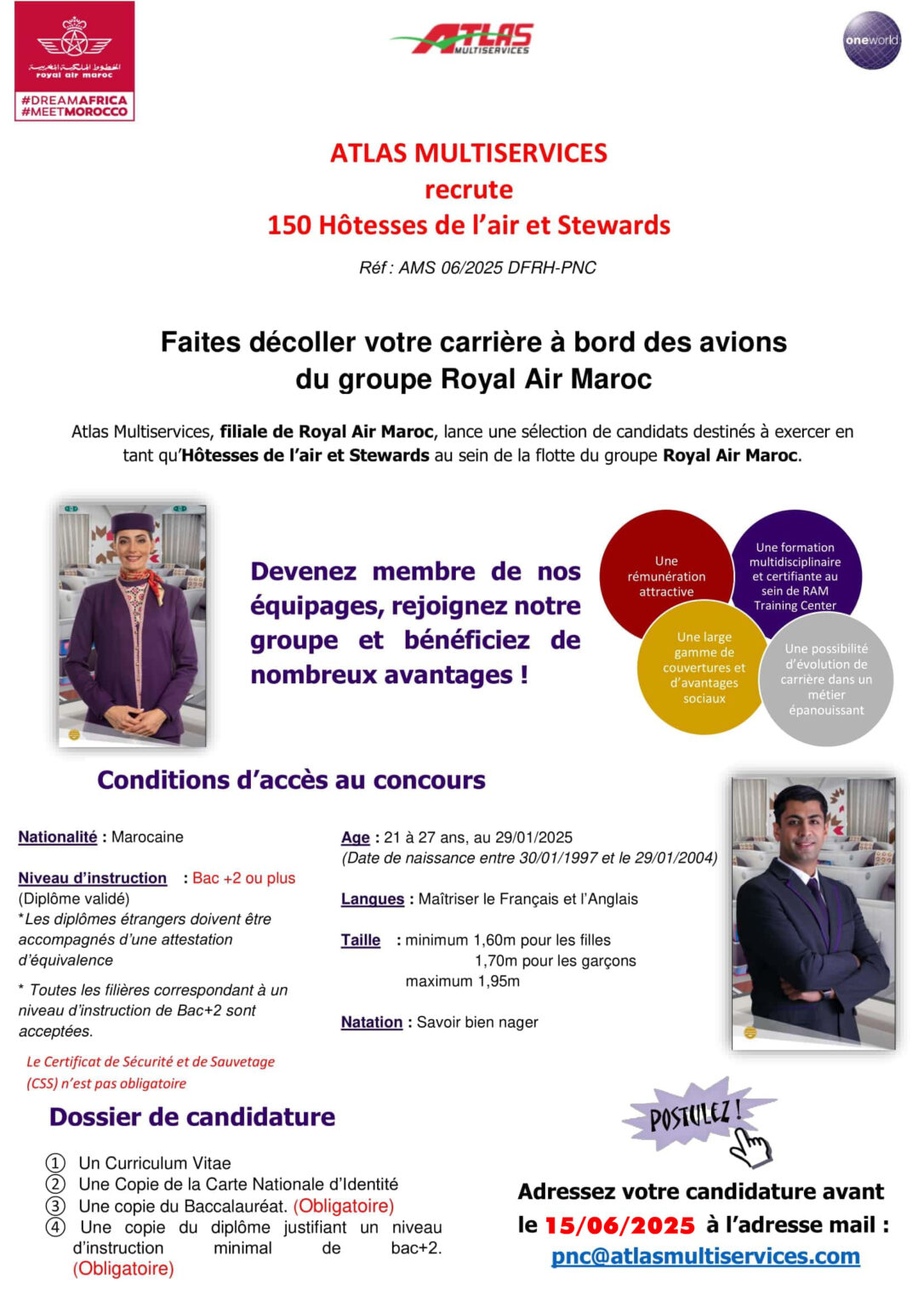 هل تحلم بالتحليق في السماء والعمل في قطاع الطيران؟ 🚀 إليك فرصة لا تُفوّت! أعلنت شركة ATLAS Multiservices، التابعة لمجموعة الخطوط الملكية المغربية 🇲🇦، عن إطلاق حملة توظيف ضخمة تستهدف توظيف 150 مضيفًا ومضيفة طيران، في إطار خطتها لتعزيز فرقها الجوية.